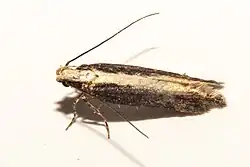 The wingspan is about 16 mm. The forewings are dark fuscous with a broad pale whitish-ochreous streak along the inner margin from the base to the apex, occupying nearly half of the wing. There are three indistinct small black discal spots, sometimes obsolete, the first in the middle, the second on the lower margin of the dark fuscous portion very obliquely before the first and the third in the disc beyond middle. The hindwings are whitish grey.[2]