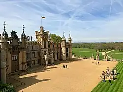 The home of the Lytton family since 1490, when Thomas Bourchier sold the reversion of the manor to Sir Robert Lytton, Knebworth House was originally a red-brick Late Gothic manor house, built round a central court as an open square. In 1813–16 the house was reduced to its west wing,[3] which was remodelled in a Tudor Gothic style by John Biagio Rebecca for Mrs Bulwer-Lytton,[4] and then was transformed in 1843-45 by Henry Edward Kendall Jr. into the present Tudor Gothic structure.[5]