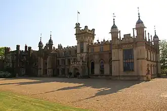 Knebworth House is an English country house in the parish of Knebworth in Hertfordshire, England. It is a Grade II* listed building.[1] Its gardens are also listed Grade II* on the Register of Historic Parks and Gardens.[2] In its surrounding park are the medieval St. Mary's Church and the Lytton family mausoleum. It was the seat of the Earl of Lytton (also Viscount Knebworth), and now the house of the family of the Baron Cobbold of Knebworth.