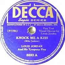"Knock Me a Kiss" is a song written by Mike Jackson (music) and Andy Razaf (lyrics).[1] It was performed by Louis Jordan and his Tympany Five, recorded in November 1941, and released on the Decca label (catalog no. 8593). The B-side was "I'm Gonna Move to the Outskirts of Town".