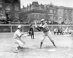 A Knox baseball player at bat in a 1908 game versus DePaul University