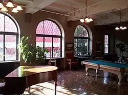 The interior of the building furnishings and layout are consistent with Spanish Colonial Revival design, featuring arched porticoes, tile flooring, diamond muntined windows, and plaster-covered walls.[6] Knox Heritage describes the building as a combination of architectural revival styles, a strength of its designer Charles I. Barber, but classifies the building as a whole as Mediterranean Revival, with more significant design features of "brick laid in Flemish bond, the water table, corbelled string course, and interior courtyard and fourth-story loggias."[2]