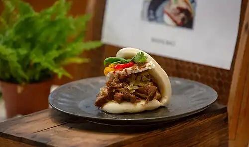 Gua bao became popular in the early 2000s in the West through chef David Chang's Momofuku restaurants (c. 2004) although he says that he was unaware that the gua bao dish already existed.[32] His Momofuku recipe was born out of a desire to use leftover pork from his ramen, and he was inspired by his dining experiences in Beijing and Manhattan Chinatown's Oriental Garden where the Peking duck was served on lotus leaf bread rather than the traditional spring pancake. He called his creation pork belly buns.[33] The name "gua bao" was used and popularised by chef Eddie Huang when he opened his BaoHaus restaurant (c. 2009).[34][35] Many other restaurants serving gua bao have opened up since then, but they often refer to the dish by the ambiguous name "bao" or the erroneous name "bao bun".