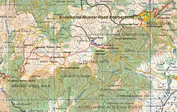 The Kodaikanal–Munnar Road (old SH-18) was located in Dindigul District and Theni District of Tamil Nadu and Idukki district of Kerala in South India. It covers 81 kilometers (50 mi) from Kodaikanal to Munnar. The road was improved by the British in 1942 as an evacuation route in preparation for a possible Japanese invasion of South India. With a maximum elevation of 2,480 meters (8,140 ft) just south of Vandaravu Peak, it was among the highest roads in India, south of the Himalayas, prior to its closure in 1990.[1][2][3]
