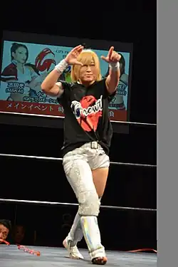 Konami debuted for World Wonder Ring Stardom on December 22, 2016, defeating Hiromi Mimura, and confirmed she would be competing for the promotion regularly.[3][18] She was pushed as a strong contender despite being a newcomer, wrestling in competitive matches against established wrestlers like Toni Storm, Io Shirai and Yoko Bito. She began a feud with Kairi Hojo, and unsuccessfully challenged for the Wonder of Stardom Championship on March 26, 2017.[19] After losing to Hojo, the two formed an alliance, and teamed with Hiromi Mimura to win the Artist of Stardom Championship on May 6, 2017, giving Konami her first ever championship.[20] They lost the titles less than a month later to Queen's Quest.[21] Konami entered her first 5 Star Grand Prix in August but struggled greatly, losing all but one of her matches, defeating Mandy Leon on the final day. At Mask Fiesta 2017 on October 29, Konami, under the ring name Masked Wan-chan, donned a mask and teamed up with Aloha Bito and Shout Woman in a loss to Chupa Panda, Iotica and Mini Iotica.[22]