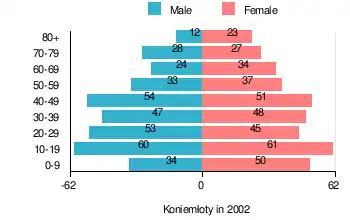 According to the 2002 Poland census, there were 721 people residing in Koniemłoty village, of whom 47.9% were male and 52.1% were female. In the village, the population was spread out, with 23.9% under the age of 18, 38.1% from 18 to 44, 19.3% from 45 to 64, and 18.7% who were 65 years of age or older.[1]
