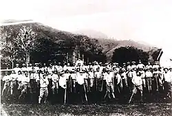 On June 10, military insignia were issued to over 100 residents who were employed in pineapple farming during the day, and the founding ceremony of the Korean National Corps was held. They began to accelerate preparations for the opening ceremony, wary of exposure to the outside world. On August 29, 1914, after the construction of the barracks was completed, they prepared the inauguration ceremony, a corps had to be organized in a military style. This is because the start of the semester was set as September 1.[3] About 600 Koreans attended the ceremony. The number of young men who first enlisted in the Korean National Corps Military Academy was 103. Military education was conducted using wooden rifles and operated under the Dunjeonbyeong system (屯田兵制). In other words, soldiers belonging to the National Corps, in addition to military training, also farmed pineapples at the farms in their garrisons.[8]