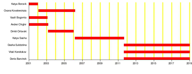 | Past members | Ekaterina Borovik Oxana Kovalevskaya Vasily Bogomya Andrei Chighir Dmitry Orlovsky Katya Sasha |