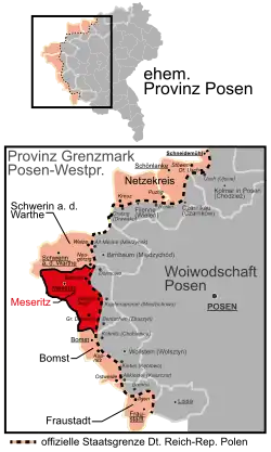 Kreis Meseritz (Landkreis Meseritz from 1939; Polish: Powiat międzyrzecki) was a district in Prussia, first in the southern administrative Region of Posen within the Grand Duchy of Posen (till 1848), then the Province of Posen (till 1920), then within the Province of Posen-West Prussia (till 1938) and at last as part of the administrative Region of Frankfurt within the Province of Brandenburg (till 1945). Its former territory presently lies in the eastern part of the Lubusz Voivodeship, a region of Poland, roughly resembling the extent of the present Międzyrzecz County.