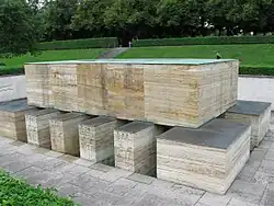 In the middle of a rectangular pit an open crypt is located, containing the statue of a fallen soldier.