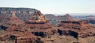 Krishna Shrine is a 6,131-foot-elevation summit located in the eastern Grand Canyon, in Coconino County of northern Arizona, US. The landform is attached at the southwest to the Vishnu Temple massif, about 1.0 mi distant. Krishna Shrine is about 3.0 mi south of the Cape Royal overlook, Walhalla Plateau (southeast Kaibab Plateau, North Rim). A twin landform occupies the southeast of Vishnu Temple, the Rama Shrine. Krishna Shrine towers about 4,000 ft above the Colorado River, about 2.0 miles south. Both Shrines, east and west, and Vishnu Temple, center, are at the headwater drainage of Asbestos Canyon. At the southwest of Krishna, on an extending arm of Redwall Limestone is a short unnamed drainage; (at the southwest is Newberry Butte at the Colorado River, and Granite Gorge). The west flank of Krishna Shrine drains into the long southwest-trending Vishnu Canyon and Creek, which comes from Freya Castle and the Walhalla Plateau, South Rim.