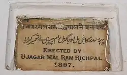 The foundation plaque mentioning Kanji Mal and Ujagar Mal Ram Rachpal as the founders of the temple in British Raj era 1897