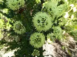 The flowers are arranged in spherical groups of 18 to 32, on the ends of branches which continue to grow after flowering. The flowers are cream-coloured to pale yellow and are surrounded by glabrous, egg-shaped bracts and bracteoles. The floral cup and sepals are each about 1 mm (0.04 in) long and the five petals are egg-shaped to almost round and 2–2.5 mm (0.08–0.1 in) long. There are about 50 to 70 stamens which are about twice as long as the petals and a style about 7 mm (0.28 in) long. Flowering occurs in October and November and is followed by fruit which are urn-shaped capsules about 6 mm (0.2 in) long.[3]