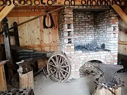 Villages were home to blacksmiths, millers, innkeepers, coopers, carpenters, wheelwrights, potters, builders, and other craftsmen. For some, craftsmanship supplemented their agricultural and animal husbandry activities, while for others, it was the main source of livelihood. Smallholding farmers and rural poor often worked seasonally in non-agricultural tasks such as forest clearing, transporting wood, assisting wealthier farmers, and making farm tools. Thanks to this versatility, Kurpie villages in Puszcza Biała were largely self-sufficient. Most needs were met within the family or village, with specialized agricultural tools and ceramics being brought in from urban centers. These were produced in places like Pułtusk, Ostrów Mazowiecka, Wyszków, and Serock.[47][48]