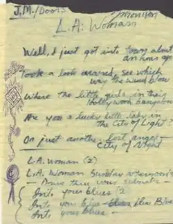 "L.A. Woman" is a song by the American rock band the Doors. The song is the title track of their 1971 album L.A. Woman, the final album to feature Jim Morrison before his death on July 3, 1971. In 2014, LA Weekly named it the all-time best song written about the city of Los Angeles.[3]