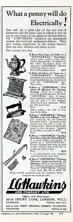 L G Hawkins & Co was a British company which manufactured small electrical domestic appliances. The company was founded by Leonard George Hawkins in 1913 in London.[1][2] Initially Leonard George Hawkins imported domestic electrical products from the USA under the ‘Universal’ brand name.