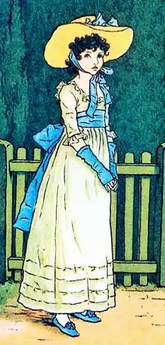 The lyrics – with their references to Piccadilly and smattering of English words – identify the "Empire" of the title as the Empire Theatre, a famous music hall on Leicester Square in London.[5][6] Its indoor promenades were hotbeds of vice where high-class prostitutes, nicknamed "Daughters of the Empire" by the British press, plied their trade, and were the target of a much-publicized 1894 attempt by social reformers to shut them down.[7] For Parisian listeners in the know this provided a salacious backdrop for the otherwise mildly "naughty" text. The Diva is an unnamed star performer at the theatre, who dresses like a little girl (complete with a "big Greenaway hat") and acts like one until she coyly lifts her skirts to reveal her "quivering" legs. Her loyal following of "snobs" and "dandies"[a] throw bouquets of flowers onto the stage while she expresses contempt for them with mocking laughter. The verse concludes, "It is all very very innocent and very very exciting."