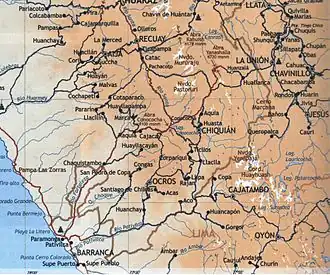 La Unión is a town in central Peru, capital of the province Dos de Mayo in the region Huánuco. The city lies over the Vizcarra River and is divided between two of the nine districts of the province, La Unión on the right bank and Ripán on the left bank. It has a regional hospital. Close to the city, over a flat highland or meseta (12,000 feet over sea level) is the old famed Inca city called Wanuku Pampa, Wanuku Marka or Wanuku Viejo. The most important festival is by the end of July and it is called "La Fiesta del Sol".[1]