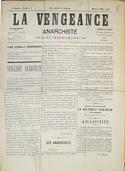 La Vengeance Anarchiste was founded in March 1883 in Paris by a group of anarchists.[1] The newspaper presented itself as the successor to L'Étendard révolutionnaire from Lyon.[1] It was published for only two issues before ceasing publication.[1] The only signed articles in the paper were by Louise Michel, Émile Gautier, and Marguerite Leloup.[1] Louis Duprat was in charge of receiving the funds destined to create the publication.[2]