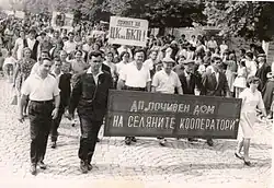 Labour Cooperative Agricultural Farm (Bulgarian: Трудово кооперативно земеделско стопанство) known in its Bulgarian acronym TKZS is an agricultural cooperative in the People's Republic of Bulgaria on the Soviet model. The TKZS were initially and by design voluntarily created, but the mass collectivization of land often led to violent measures to socialize the property of a large part of the rural owners - especially the richest. The cooperation of farmers in various profiles of agricultural production and sales of production until 1944 developed according to principles and structure corresponding to those in other countries in Europe. Until then, Bulgaria was in second place in the world in terms of development of the cooperative movement after Denmark[1] with consumer, credit and savings and agricultural cooperatives created mainly after the First World War. Agricultural producers become members and unite in cooperatives by industry, participating with share capital or membership fees to achieve the goals of these voluntary associations - mutual assistance, a uniform pricing policy, innovations and a commercial structure for the sale of the produced product. The governing bodies are elected and are accountable for their activities to all members of the cooperative.