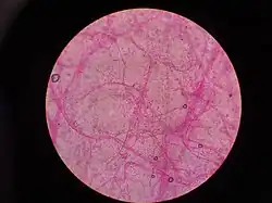 A Lactofuchsin mount (also spelled Lacto-fuchsin or Lacto-Fuchsin) is a technique used for mounting fungi with hyphae on a microscope slide for examination.[1] The main advantage of a lactofuchsin mount is that if performed correctly, it preserves the structure and arrangement of any hyphae that are present.