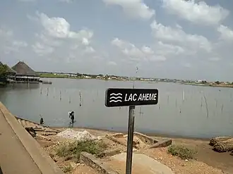 Lake Ahémé is Benin's second largest lake, with an area of 78 square kilometres (30 sq mi) in the dry season which expands to 100 square kilometres (39 sq mi) in the rainy season.[2] The lake is 24 kilometres (15 mi) long and has an average width of 3.6 kilometres (2.2 mi).[1] The Couffo River drains into the swampy north end of the lake, while the 10 km-long Aho Channel connects the lake's southern end to the Grand-Popo Lagoon on the Atlantic coast.[2] This channel flows south during the wet season but reverses direction in the dry season, which causes the salinity of the lake's southern end to increase.[2]