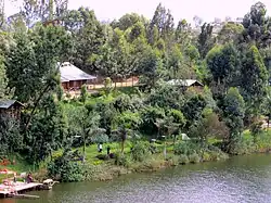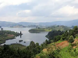 The lake was formed about 18,000 years ago by a volcanic eruption blocking a valley in the Ruchiga mountains near the present day village of Muko on the north-west tip of the lake.[12] The lake's current outlet is a small stream also by Muko which flows into the Ruvuma swamp (this in turn flows into the Ruhezaminda river that ends at Lake Mutanda). The lake is about 22 km long and 6 km at its widest and at a height of about 1973 m.[2] It is surrounded by mountains that reach heights of 600 m above the lake.[12][13]