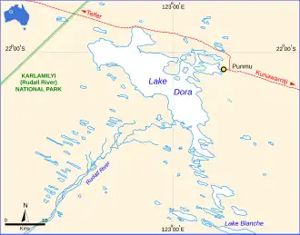 Lake Dora (Wanman: Ngayartakujarra)[3] is a seasonal salt lake located in the Pilbara region of Western Australia. It lies between the vegetated sand fields of the Great Sandy and Gibson Deserts. The Rudall River occasionally flows into Lake Dora.[4]