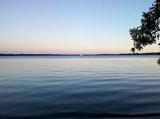 Lake Kampeska is a 5,250-acre (21 km2)[1] inland glacial lake in the U.S. state of South Dakota. It is located west-northwest of Watertown, South Dakota and lies entirely within Codington County and the Coteau des Prairies. The lake is naturally shaped and the most urban developed lake in South Dakota with approximately 13.5 miles (20 km) of residential shoreline.[2] Lake Kampeska is connected to the Big Sioux River through a single inlet-outlet channel located on the northeast side. It is the third largest natural lake within the borders of South Dakota.
