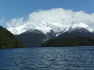 Lake Menéndez occupies the deepest lake trough, a narrow fjord-like valley, in Chubut Province. It was formed by the convergence of two glacial tongues.[2] Near the middle of its 26 kilometres (16 mi) length the lake divides into two arms, running at right angles to each other, one continuing northwest, the other turning southwest. The two arms are separated by Mount Torrecillas which rises to 2,213 metres (7,260 ft)[3] in elevation. The Torrecillas glacier descends to within a few hundred meters of the lake's shoreline. Flowing into Lake Menéndez are several small streams originating in the snowfields and glaciers along the border with Chile, 10 kilometres (6.2 mi) distant.[4]