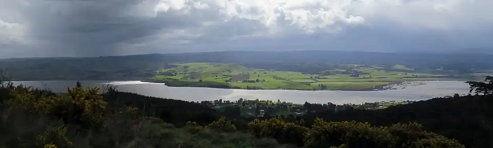 Panorama of Lake Waihola, seen from the hills to the southeast. Part of the settlement of Waihola is visible in the centre of the image.
