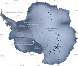 Lake Whillans is a subglacial lake in Antarctica. The lake is located under the Whillans Ice Stream at the southeastern edge of the Ross Ice Shelf in the west of the continent. The lake surface is 800 m (2,600 ft) beneath the surface of the ice and the lake covers an estimated area of 60 km2 (20 sq mi). Lake depths measured thus far have been around 2 metres (7 feet).[1] Its temperature is −0.49 °C,[2] below 0 °C because of the high pressure.