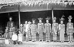 A group of dancing girls with distinguished headdress from Lampung in full regalia, 1929.