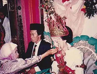 A Lampung bride and bridegroom in 1987. Both of the couples are of the Sungkai Bungamayang clan. The traditional headgear of the bride, which is called Siger, is commonly used in Lampung weddings.
