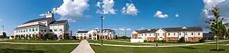 Panoramic shot of Teague Learning Commons, Charles Frey Academic Center, and Peterson Dormitory