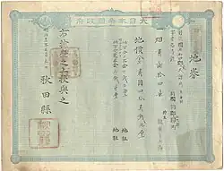 The Japanese Land Tax Reform of 1873, or chisokaisei (地租改正) was started by the Meiji Government in 1873, or the 6th year of the Meiji period. It was a major restructuring of the previous land taxation system, and established the right of private land ownership in Japan for the first time.[1]