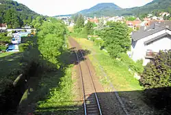 As a result of German defeat in World War II, there was an initial decline of the Landau–Rohrbach railway when the second track of the line was removed between 1945 and 1948 as part of German reparations during the French occupation.[11] Also affecting the development of the Southern Palatinate line was the electrification of the Palatine Ludwig Railway, which took place in the years 1960–1964. Especially in the Kaiserslautern–Neustadt section, the difficult topography (including many tunnels) meant that this work required single-track operations and speed restrictions so that the capacity of the line was limited. For this reason, during the same period freight traffic was diverted over the Queichtalbahn, so that there was an initial increase of traffic on the line. However, this changed with the completion of electrification work in 1964. The freight on the Queichtalbahn declined rapidly as it now largely ran over the much higher-capacity Palatine Ludwig Railway. For passengers, the line regained some of its importance for the operation of long-distance trains, especially from Saarbrücken to southern Germany, because the line is somewhat shorter that the Palatine Ludwig Railway. In this context, Landau also received a new station building, as the old building was very badly damaged during the war. The centenary of the line in 1975 was celebrated with steam train services, among other things.