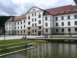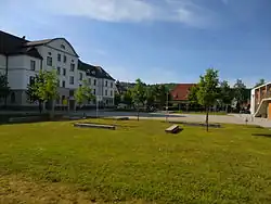 The Landesgymnasium's campus is situated at the University park in the east of Schwäbisch Gmünd. During the 20th century it was used as barracks initially by the German Army (Bismarck Kaserne) and then after WWII as a US military base with nuclear Pershing II missiles stationed nearby, which were eliminated in 1990. In 1992, the US forces withdrew and the campus was used as a spin-out of the University of Maryland University College until 2002. School building, boarding houses and teachers' flats are situated in the recently renovated barracks while the canteen and a gym were newly built on the former parade ground.[1]