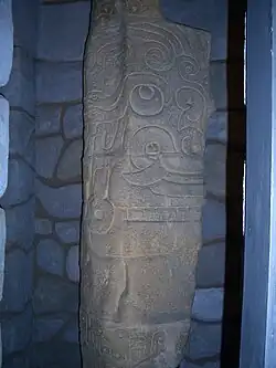 The Lanzón is a granite stela that is associated with the Chavín culture.[1] It is located in the Old Temple of Chavin de Huantar which rests in the central highlands of Peru. The Chavín religion was the first major religious and cultural movement in the Andes mountains, flourishing between 900 and 200 BCE. The Lanzón itself was erected during the Early Horizon period of Andean art circa 500 BCE[2] and takes its name from the Spanish word for "lance," an allusion to the shape of the sculpture.[3] The name is deceiving, as its form more closely resembles a highland plow which would have been used for agricultural purposes at the time.[4] It is suspected because of this that the deity depicted is linked to agrarian worship.
