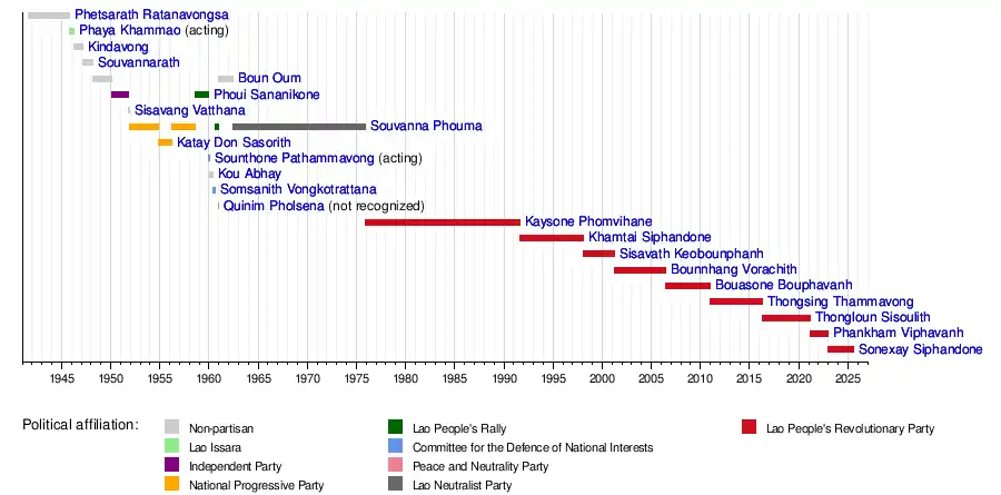 Sonexay SiphandonePhankham ViphavanhThongloun SisoulithThongsing ThammavongBouasone BouphavanhBounnhang VorachithSisavath KeobounphanhKhamtai SiphandoneKaysone PhomvihaneQuinim PholsenaSomsanith VongkotrattanaKou AbhaySounthone PathammavongKatay Don SasorithSouvanna PhoumaSisavang VatthanaPhoui SananikoneBoun OumSouvannarathKindavongPhaya KhammaoPhetsarath Ratanavongsa