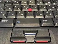 Closeup of a TrackPoint cursor and UltraNav buttons on a ThinkPad laptop