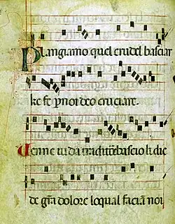 Folio 46v of the Laudario di Cortona, with the song "Plangiamo quel crudel basciar[e]"