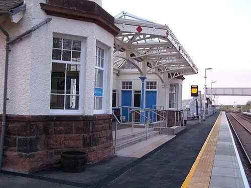 Laurencekirk railway station is a railway station serving the communities of Laurencekirk and The Mearns in Aberdeenshire, Scotland. The station was reopened on 17 May 2009 at a cost of £3 million.[4] It is between Montrose and Stonehaven, on the Dundee to Aberdeen line. There is a crossover at the north end of the station, which can be used to facilitate trains turning back if the line south to Montrose is blocked.[5]