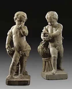 Gillis also made small-scale works. Examples are the two small stone statues of putti, signed and dated 1743 (Sotheby's auction of 9 July 2008 lot 152). The figures appear to symbolise seasons: one has a basket of grapes behind him and is eating some grapes, which is likely an allegory of autumn, while the other has a wheat sheaf behind him and is holding a nest of birds, which is likely an allegory of summer.[5]