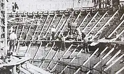Construction was started in early April 1958 and the tower was topped out on 26 September 1958.[3]: 6 The casting of the tower took about 100 tonnes of iron and 450 cubic metres of special concrete mass.[3]: 5 The tower was first filled with water in October, when it underwent a so-called tightness test. The tower was officially taken into use on 13 November 1958.[2]: 68 After this, reinforcing elements were placed on the outer surface of the tower and construction was finally complete in February 1959.[3]: 6
