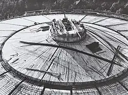 The outer shell and support ring of the tower were pre-tensed concrete to prevent tensions and subsequent damage in the structure. The pre-tension was done in accordance to the Dywidag system, where the tension steel has a diameter of 26 mm.[3]: 8 The Lauttasaari water tower was the first water tower in Finland to use pre-tensed concrete.[7]: 41 The concrete walls were 25 cm thick. The outer walls and the support ring were cast without interruption, to prevent folds from appearing between the structures and to ensure water-tightness. The work was done in three shifts and took four days in total.[3]: 11 The roof of the tower was built from copper.[9]: 39