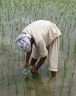 ![]() A farmer in Punjab determining the nitrogen levels in a rice paddy by using a leaf color chart. | |