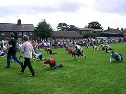 Lealholm Village Show and sports day is held by the Lealholm Farm Produce and Horticultural Society on the first Saturday in September.[34] The show, known as the Lealholm Agricultural Show, takes place on the village sports field, usually reserved for cricket during the summer months, and football during winter.[35] It held its 87th show in 2007. There was no show in 1970, and in 2001 the organisers decided it would be inappropriate to hold the show due to the Foot and mouth outbreak. In 2008, the show was cancelled for the first time in its history. Due to bad weather, the cricket pitch became waterlogged after weeks of heavy rain and a torrential downpour in the days leading up to the show.[36] The show has over 200 exhibitions of crafts, wine making, fruit, vegetables and farm produce for competition including categories for children.[37] Children's sports and a fancy dress parade are held on the cricket pitch and are always well supported, although there usually has to be a lot of persuasion for entries into the adult's "Twice round the field" competition. Side stalls include "Bowl for a Goose", where competitors attempt to bowl five balls through holes in a frame at the end of a short but bumpy pitch. The winner can take home a live goose, have it delivered for Christmas or receive a cash prize.[35]