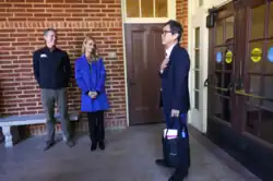 Herrick standing outside of building next to Governor Gavin Newsom and Jennifer Siebel Newsom