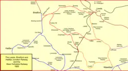 The LB&HJR arranged for the Great Northern Railway (GNR) to work its line. This enabled the GNR to incorporate through running to Halifax into its own network.[7] The Lancashire and Yorkshire Railway (L&YR) also had running powers over the LB&HJR, and used these for through expresses.[6] The LB&HJR line passed Bradford at some distance, and in the following parliamentary session the LB&HJR obtained authorisation for a branch line to an independent Bradford terminus, from a junction on its own line at Laister Dyke; also authorised was a colliery branch to Gildersome. The relevant act of Parliament, the Leeds, Bradford and Halifax Junction Railway Act 1853 (16 & 17 Vict. c. cxi), was passed on 4 August 1853. The Bradford terminus became known as Adolphus Street.[5][7]